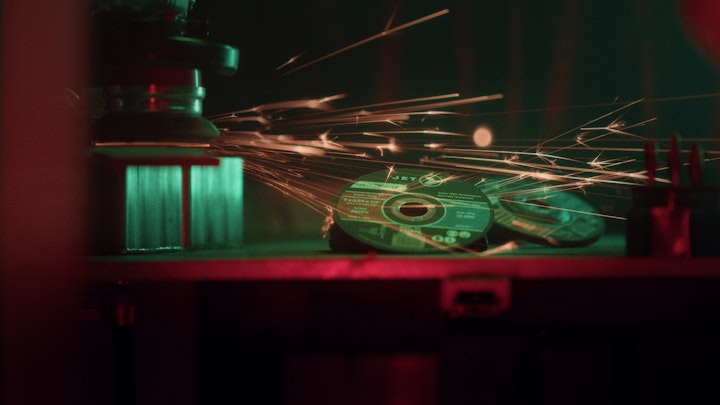 A woman in a helmet working on a machine. Sparks fly in a dark industrial shop on metal.